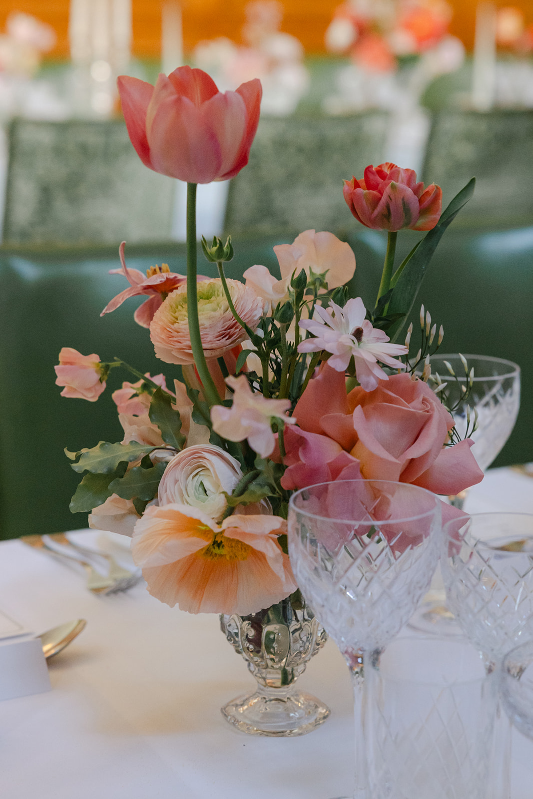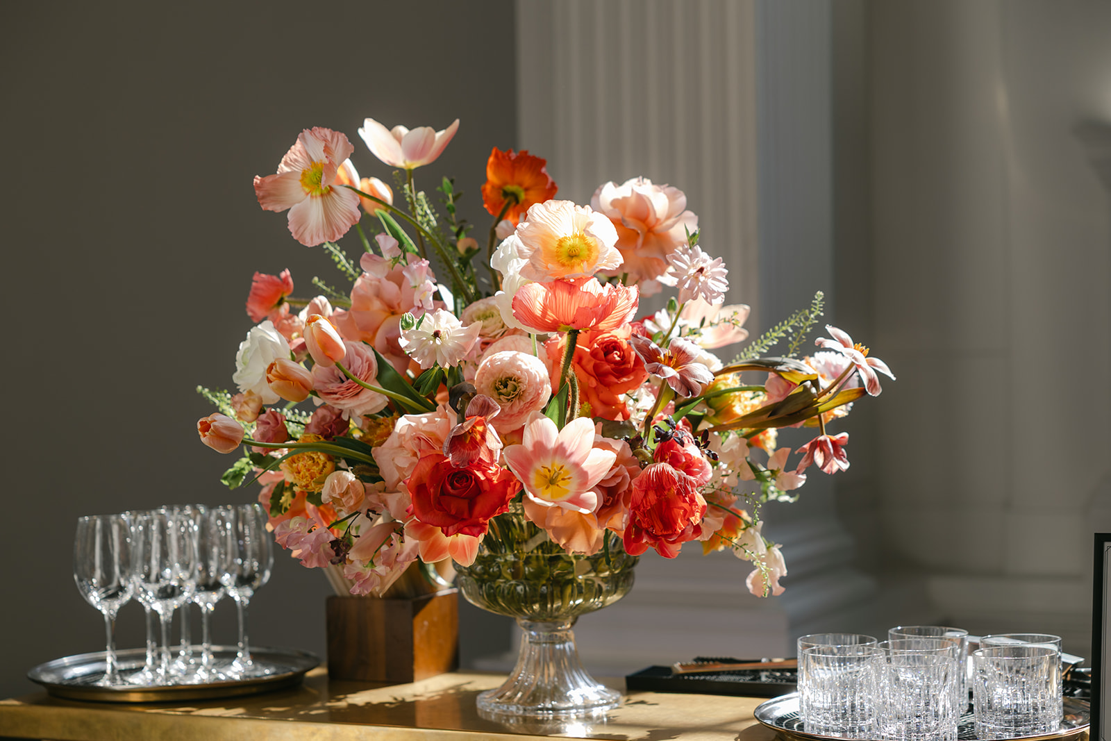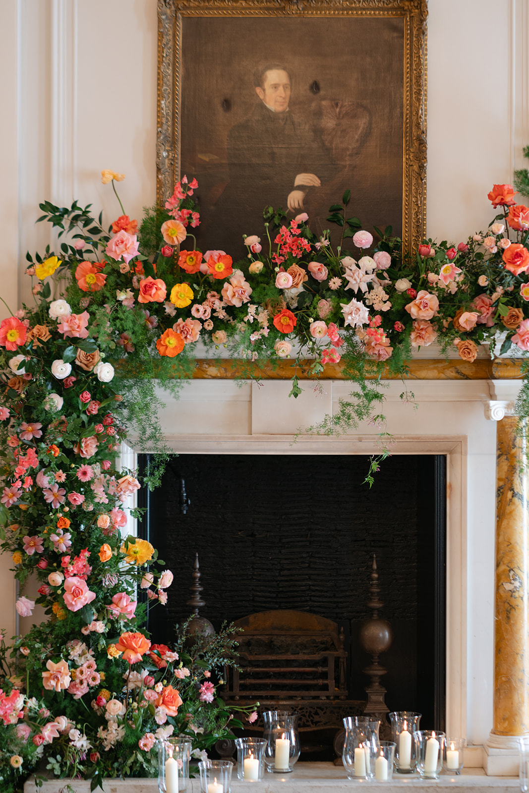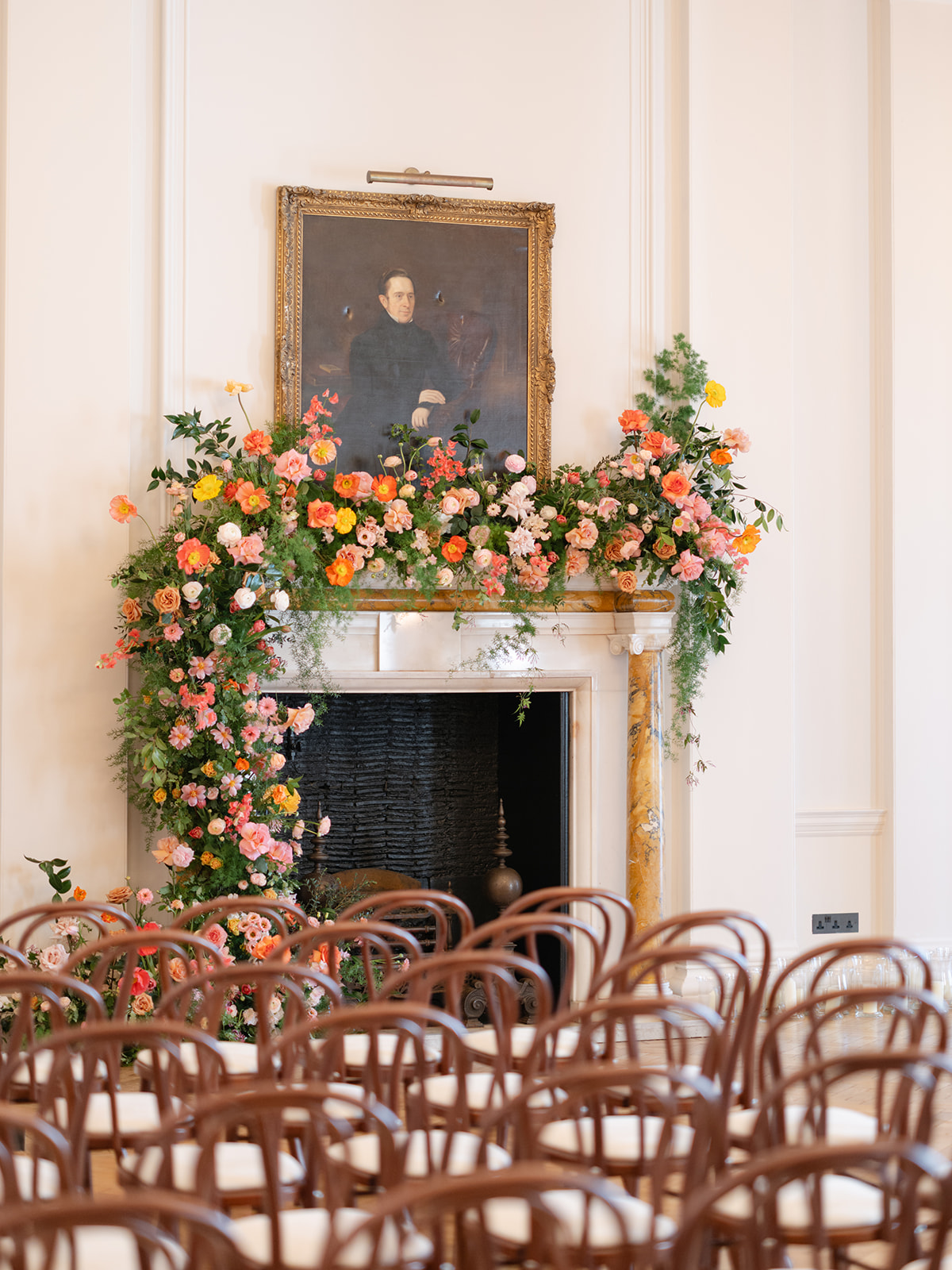 The brief was to use bright and deep spring shades for a joyful and elegant celebration. Spring is a beautiful time for flowers. We used Icelandic poppies in all of their colours, tulips in sepia, bright salmon pink and coral, ranunculus, roses in watermelon and mustard, sweet peas in champagne and pink edged, with touches of spring green foliages. A riot of colour, perfect for the setting of The Ned.