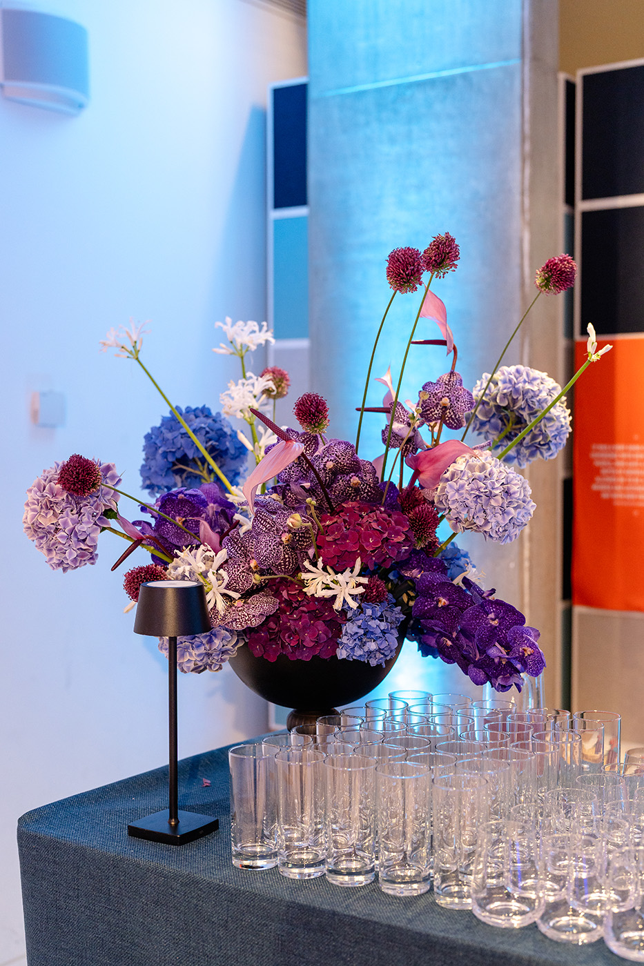 Pillowy hydrangea, vanda orchids, anthuriums, cosmos, burgundy foliages paired with black and clear reflective glass accessories struck the perfect balance.