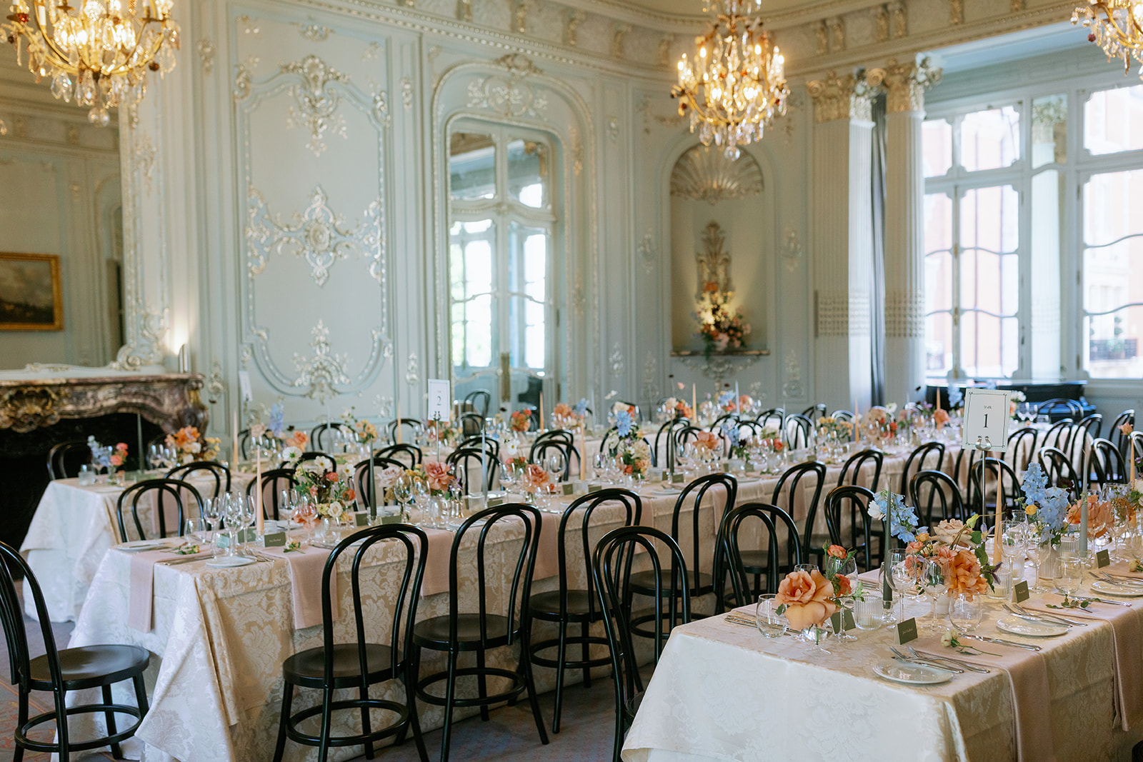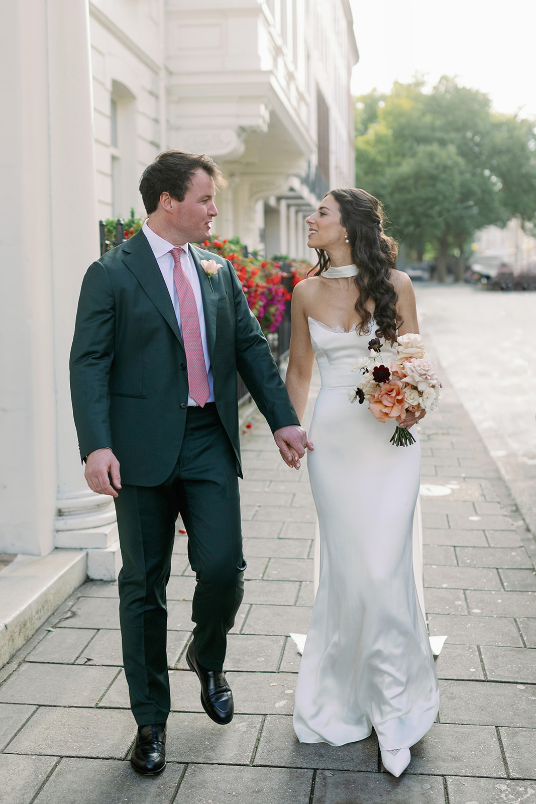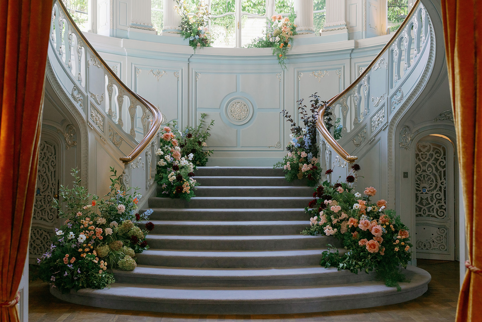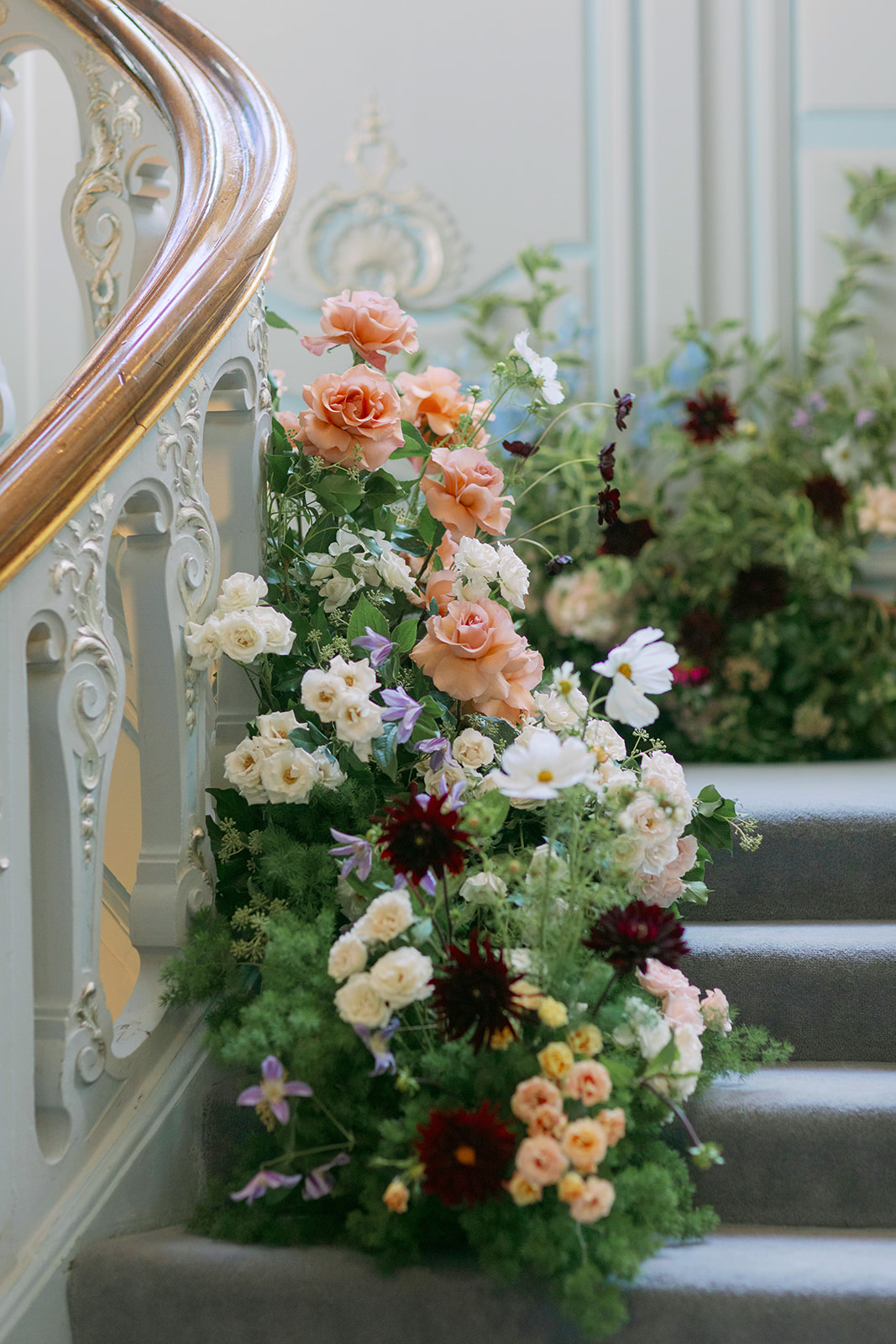 For E&E’s wedding in September, they chose a primarily pastel scheme with hints of burgundy and vibrant coral for a late summer vibe. The style was to be asymmetric, seasonal, gardenlike, and grouped, which we loved! A real moment of the day was the beautiful staircase design, which was grouped yet natural, climbing up from the bottom steps, reaching the banister in places.