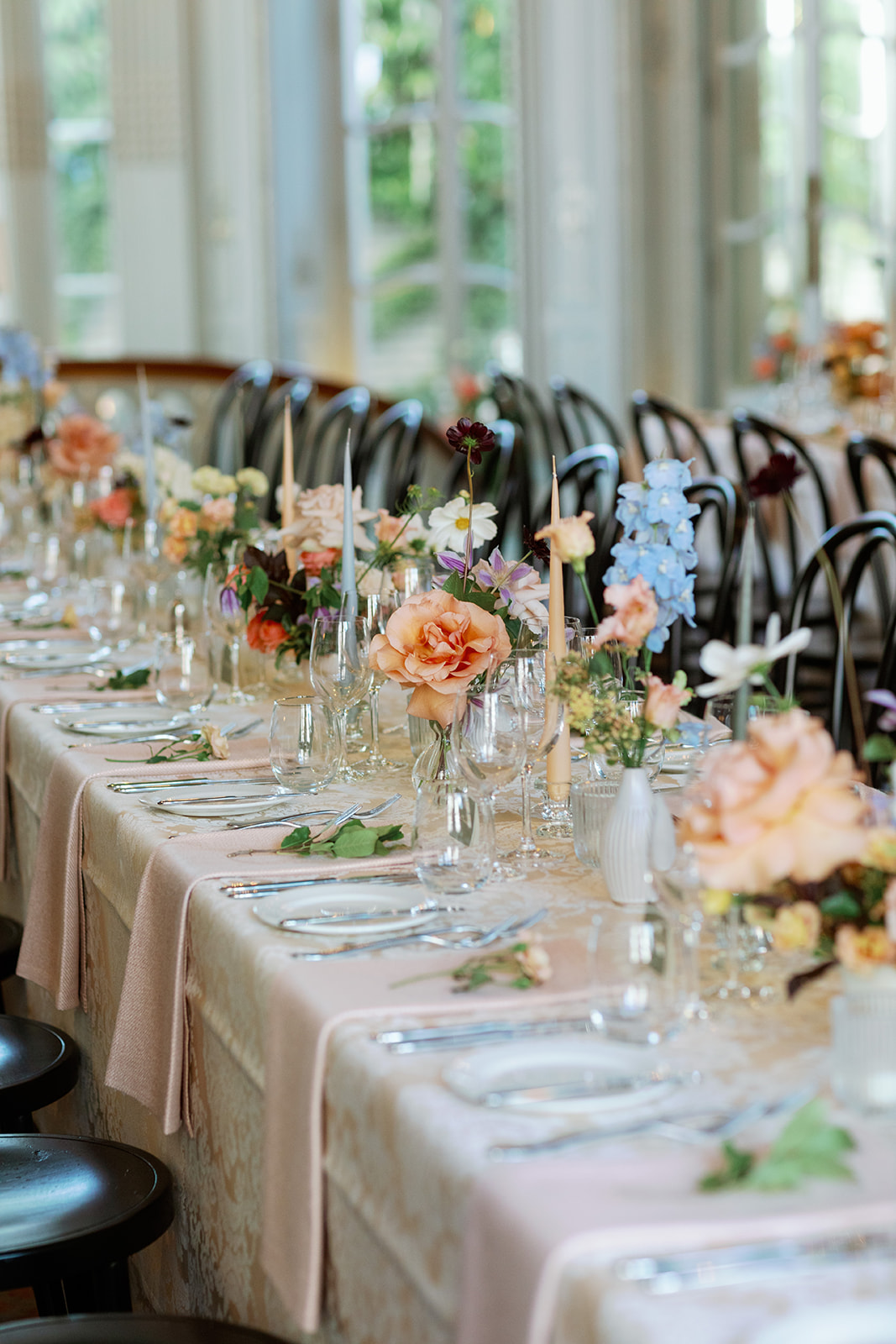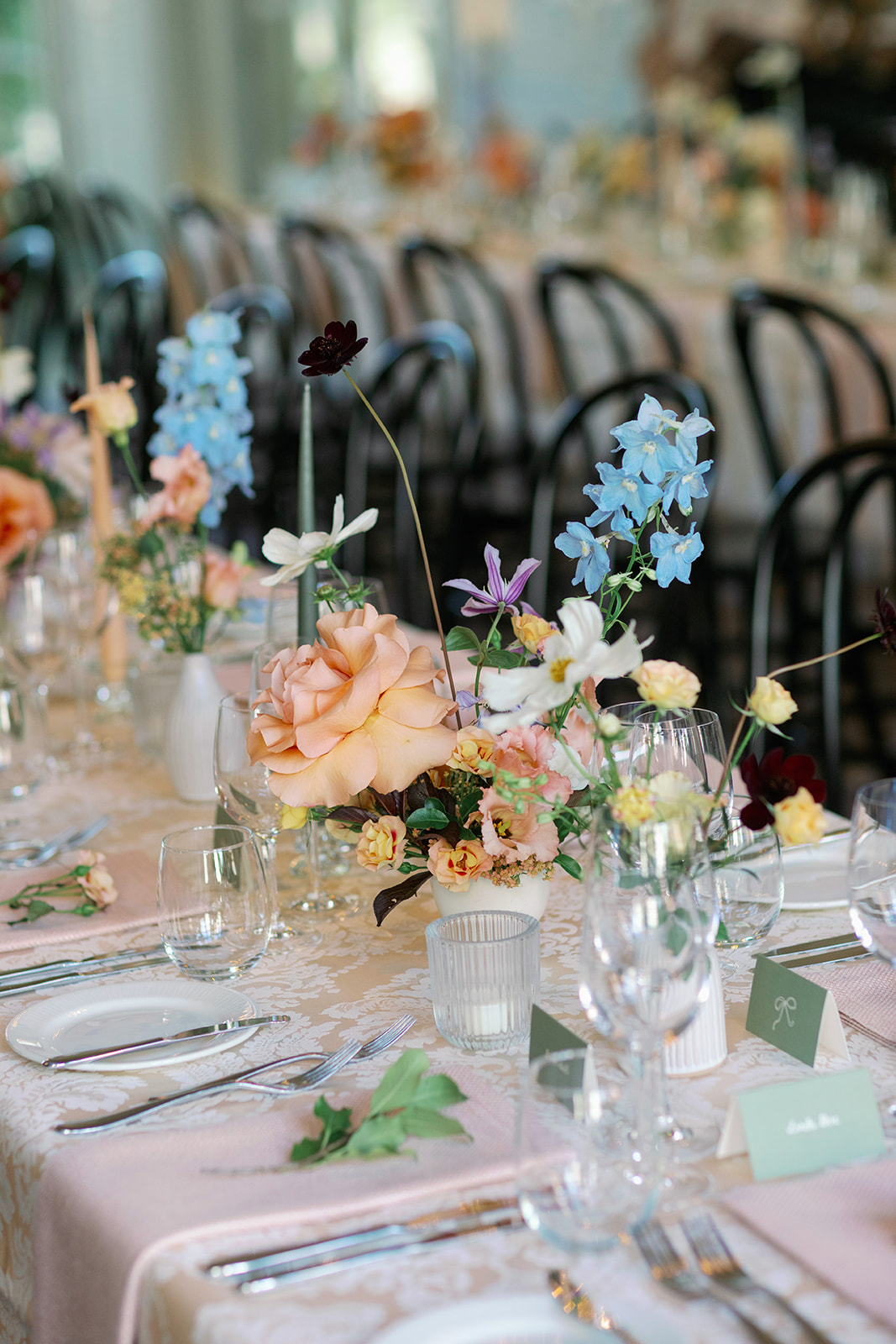 For the dining tablescape, we created a candlelit installation of flowers and candles, combining different textures and tones of vaseware for an eclectic, yet cohesive scheme.
