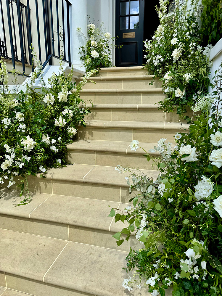 We designed some key moments for the celebration, including dressing the exterior staircase into a living floral meadow, fireplace decor, welcome signage and dining tables, using a beautiful combination of reflexed roses, sweet peas, butterfly ranunculus, delphinium, larkspur, orlaya, ammi, scabious and other seasonal, delicate flower stems with wisps of trailing jasmine and foliages.