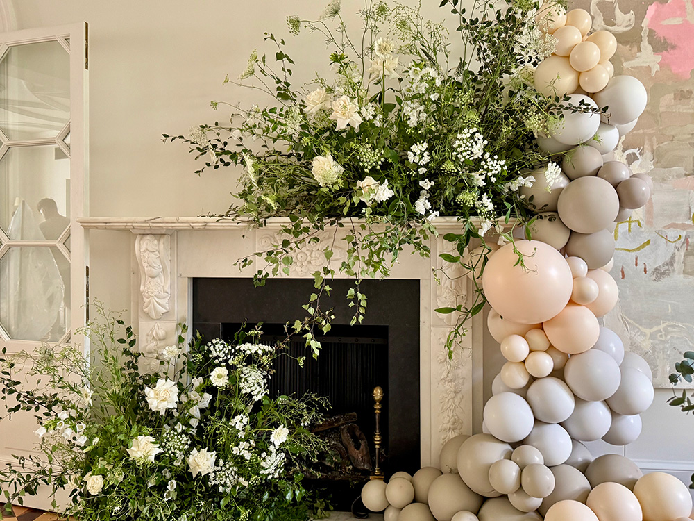 The fireplace was dressed to create a soft and sculptural focal point. Fresh flowers and foliages, crafted into lush and organic meadows were designed to complement the balloon installation which cascaded from one side of the mantle to the floor.