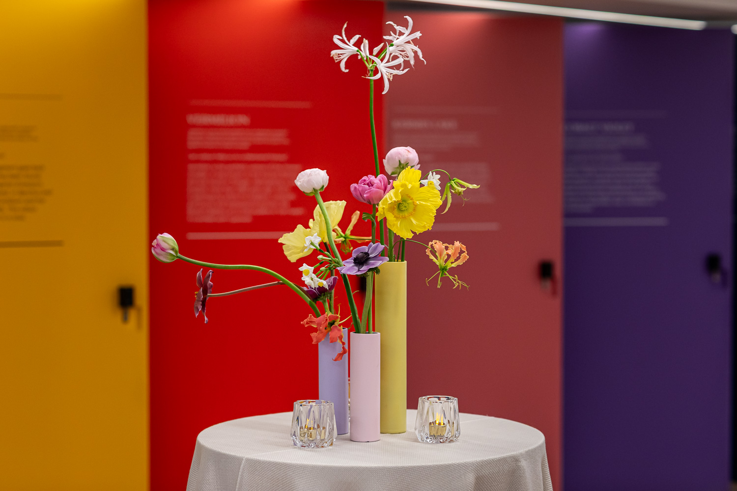 We were delighted to create fresh and seasonal spring displays to celebrate the launch, choosing a playful, pastel colour palette with pops of hot colour woven through for a contemporary, youthful twist. Slim vases evocative of crayons or coloured chalks were hand painted by our team to pick up on the blocks of inspiring colour in the centre.
