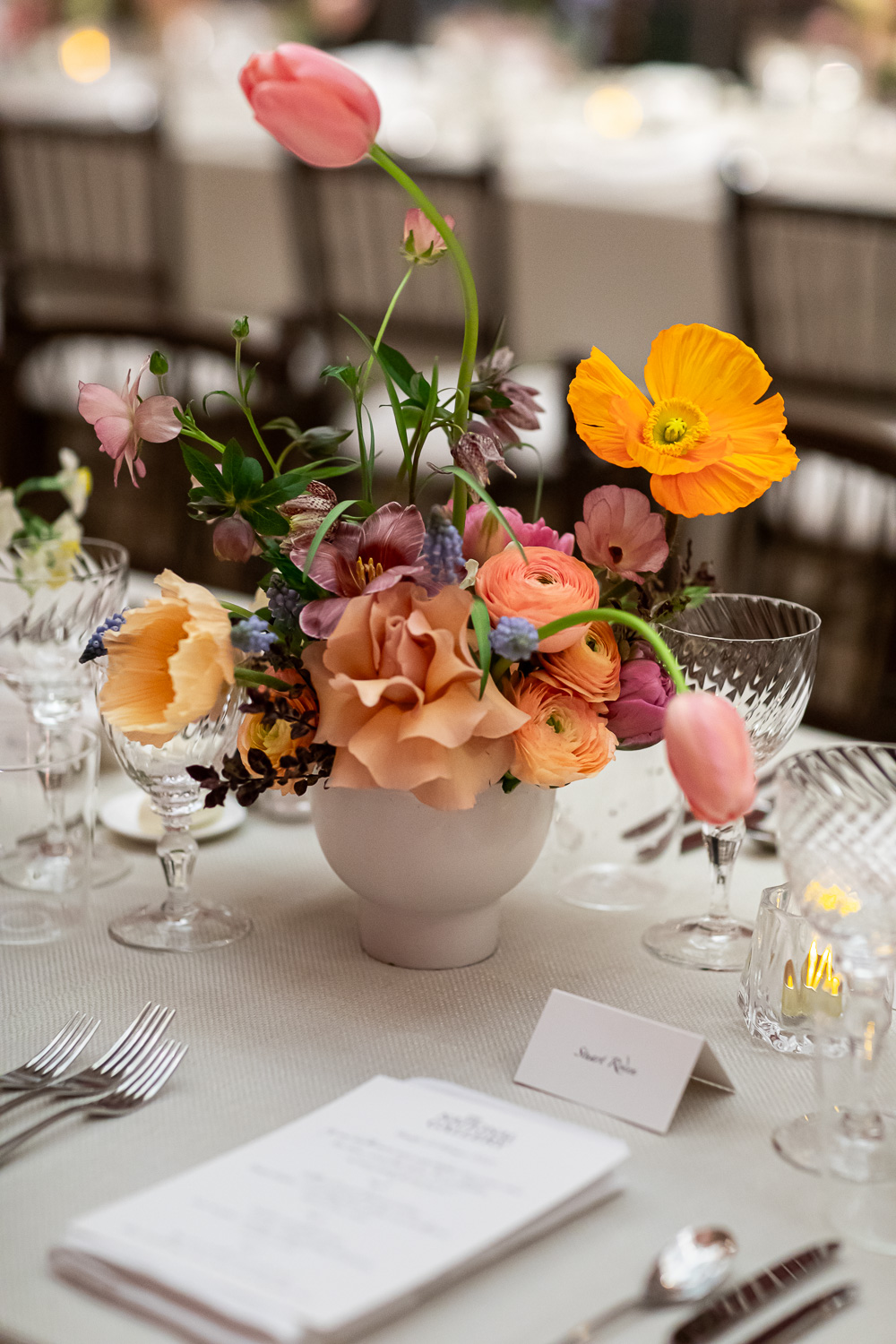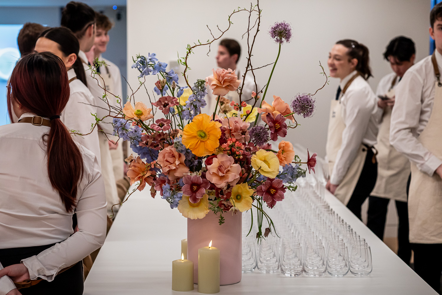 For the celebratory dinner in the Gallery, we filled contemporary ceramic bowls with our favourite flowers of the season including tulips, ranunculus, fritillaria, anemones, hellebores and poppies. Vibrant yet refined – a true celebration of the joy of colour and the changing seasons.