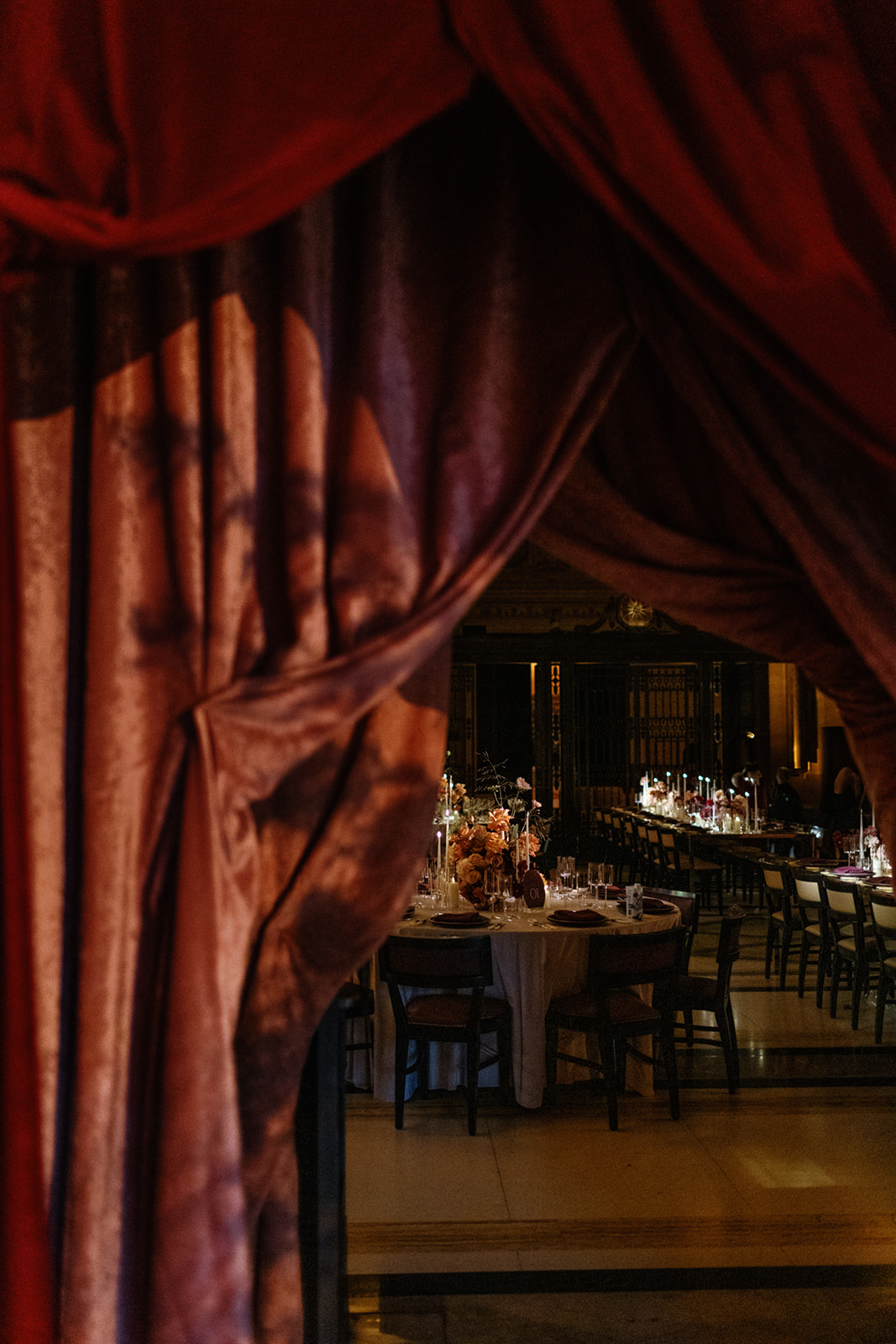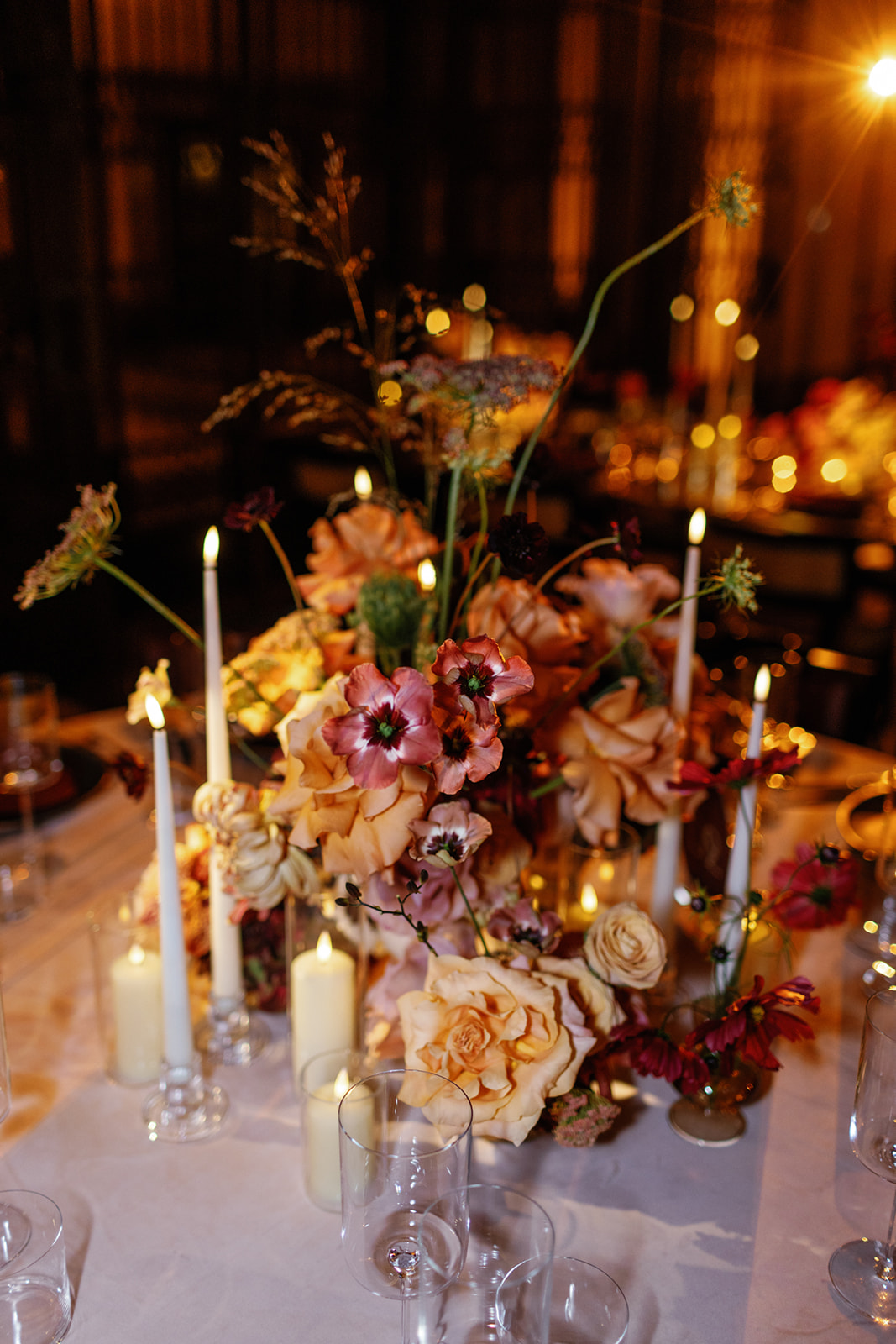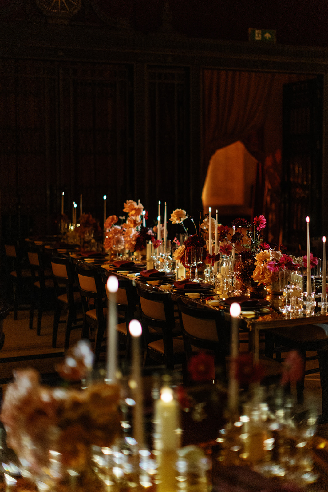 Branched English oak with rosehips shone like jewels decorated a grand escort card table display, before a vast velvet curtain was swept back to reveal dinner in the Vestibules. Mirrored tables reflected hundreds of velvety cosmos, grasses and roses while candles from our collection sparkled at every level.