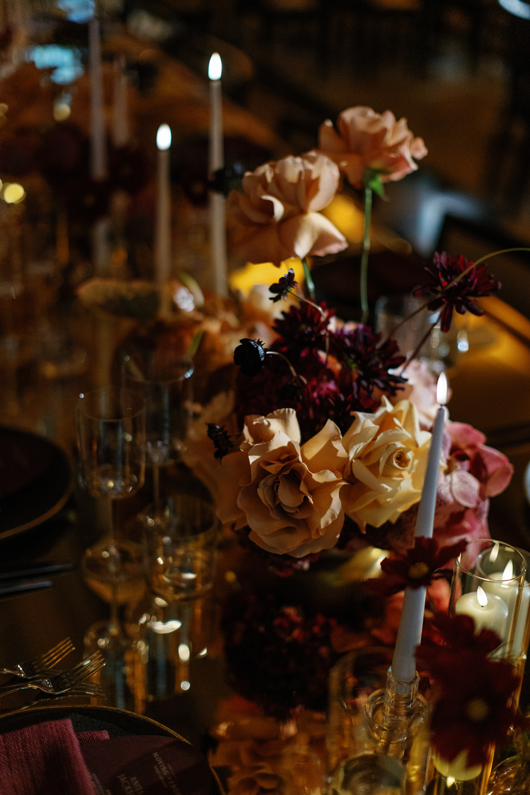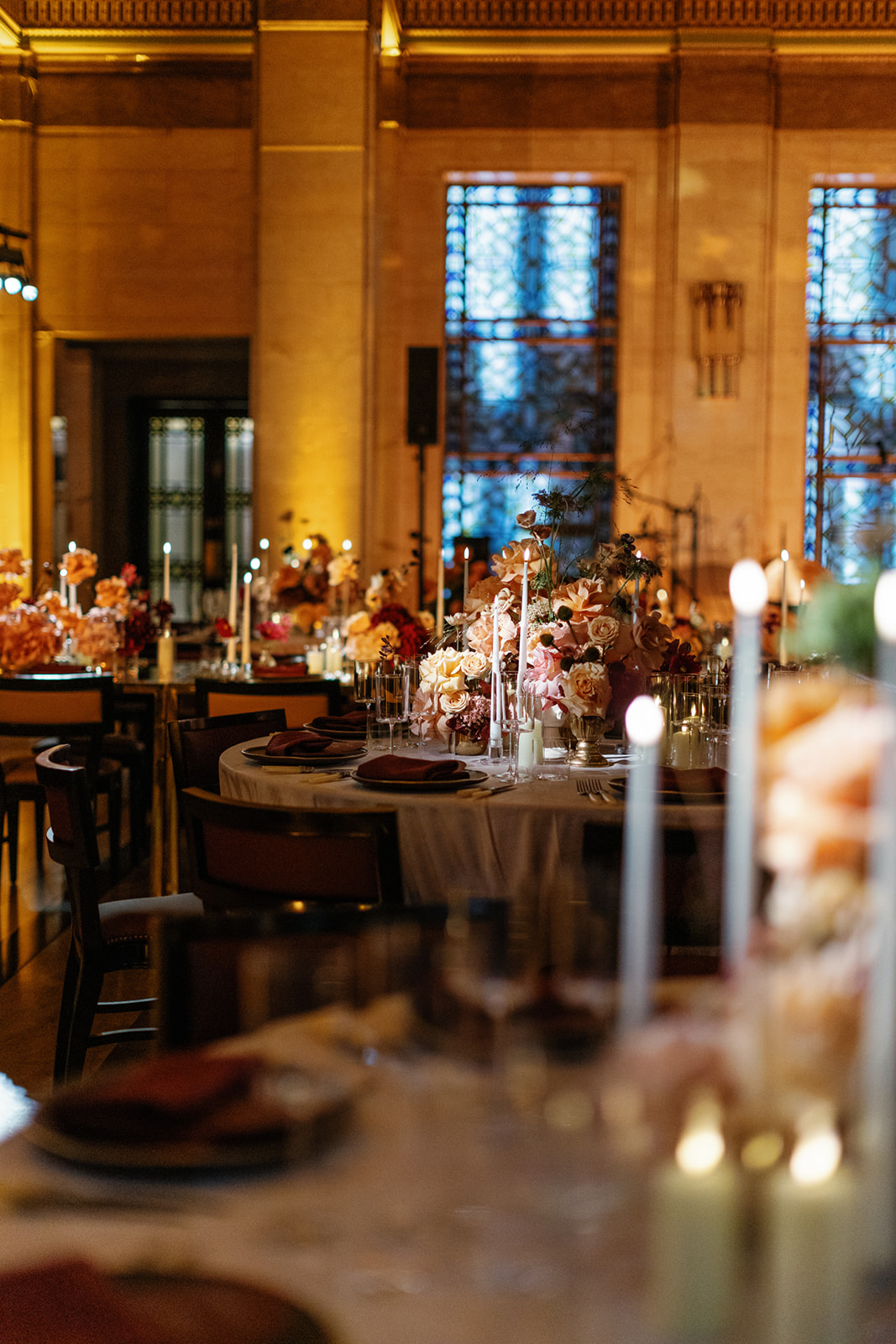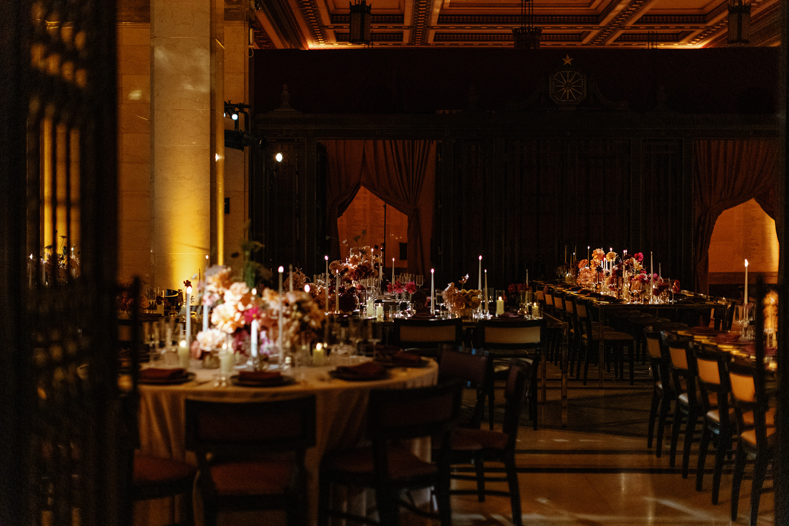 Branched English oak with rosehips shone like jewels decorated a grand escort card table display, before a vast velvet curtain was swept back to reveal dinner in the Vestibules. Mirrored tables reflected hundreds of velvety cosmos, grasses and roses while candles from our collection sparkled at every level.