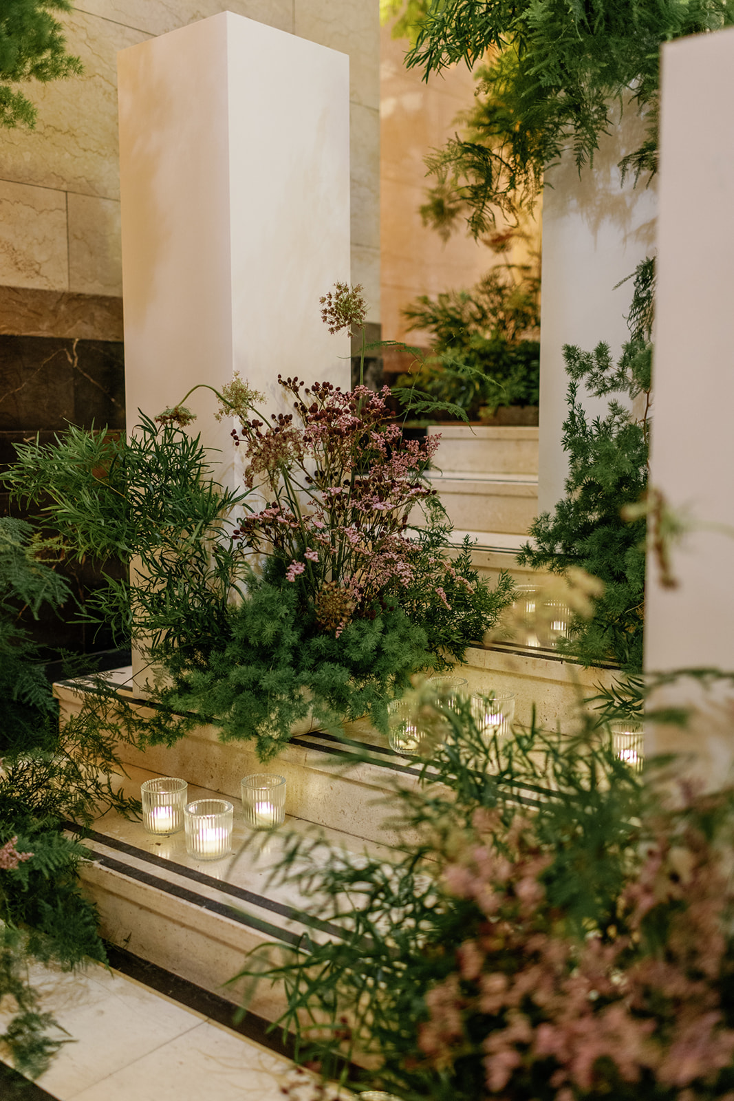At the entrance, clouds of foliage intermingled with starlike September flowers creating an ethereal entrance into the champagne reception. Moving Venue’s canapes became works of art.